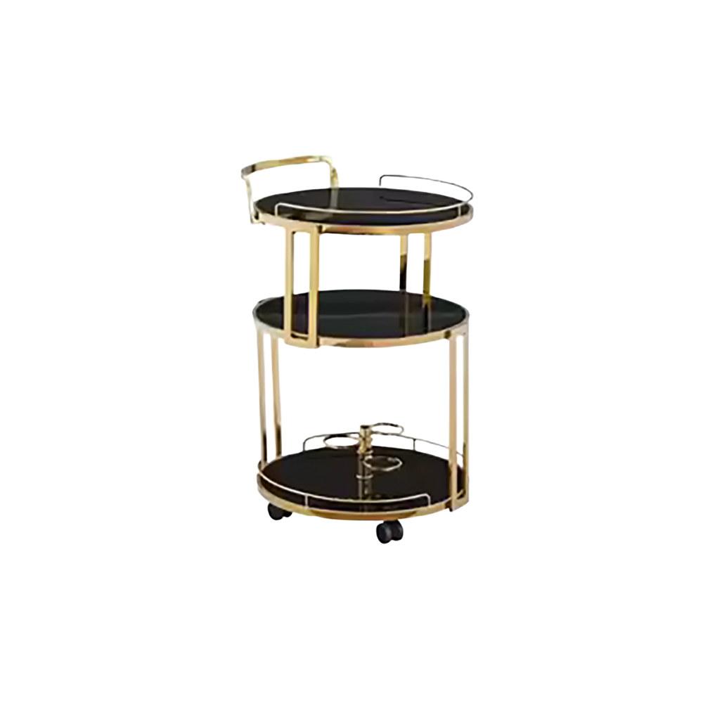 Elegant 3-tier serving trolley with a gold metal frame and black tempered glass shelves. Features smooth wheels for easy mobility, ideal for serving or stylish storage.