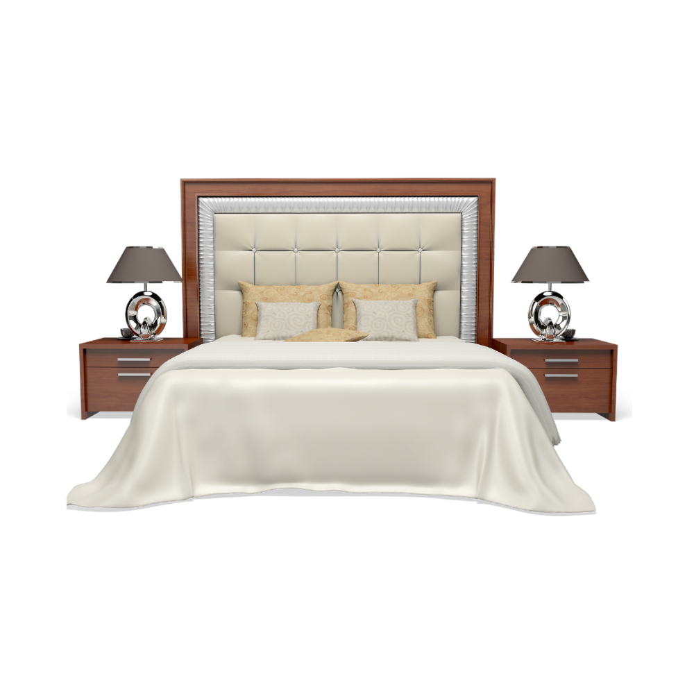 This classic king size bed features a solid wooden frame with a tufted upholstered headboard for comfort and elegance. Paired with stylish side tables, it offers durability and timeless appeal. Size: King. Quality: Premium and long-lasting. Material: Solid wood, high-density foam, and fabric upholstery.