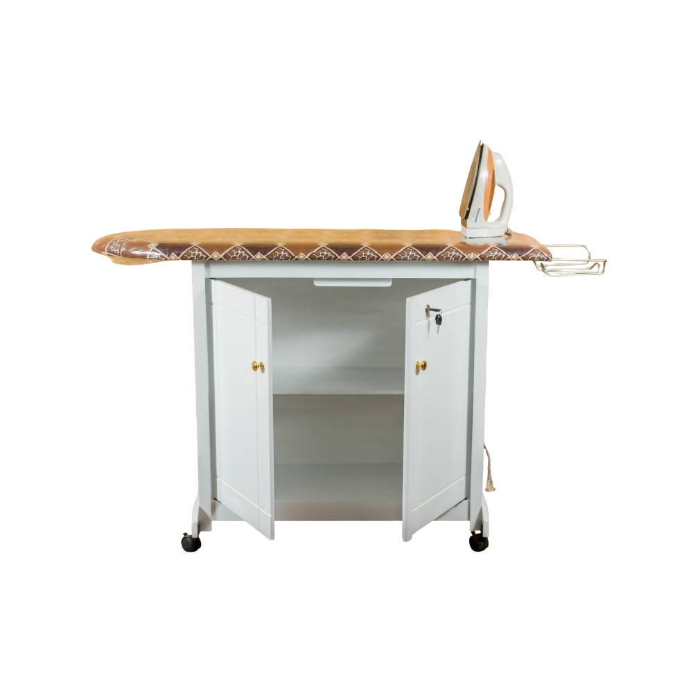 A practical ironing board cabinet made with a strong iron frame and storage space. It features a two-door cabinet with shelves, a side iron holder, and caster wheels for easy mobility. Designed to save space while keeping ironing essentials organized.