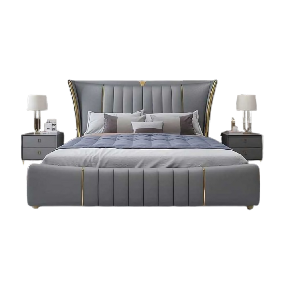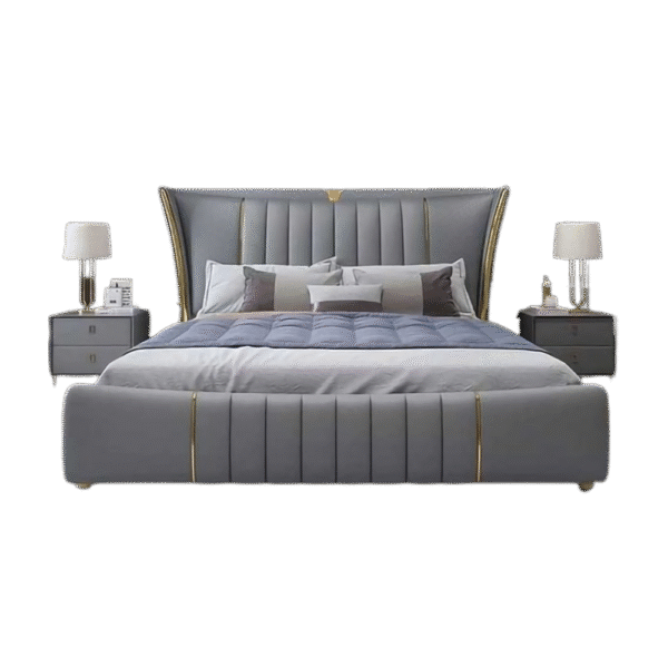 Modern king size bed with a solid wood frame, premium grey upholstery, and golden detailing. Comes with two matching side tables for a complete luxury look.