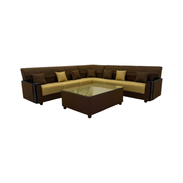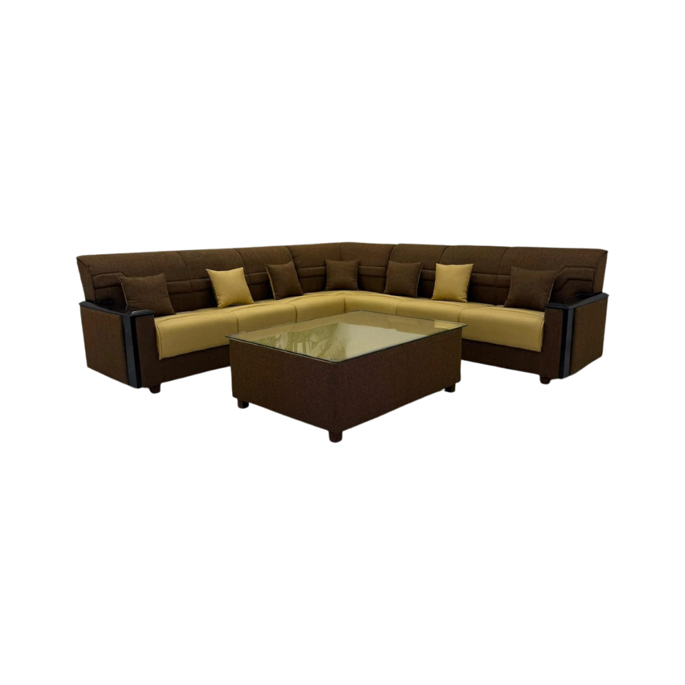 Enhance your living room with this spacious L-shaped corner sofa set, designed in a rich brown and beige contrast. Upholstered in premium fabric with high-density foam cushions, it offers superior comfort and support. The set includes a matching square center table with a glass top, making it a perfect blend of style and functionality. Ideal for family lounges, living rooms, or office reception areas.