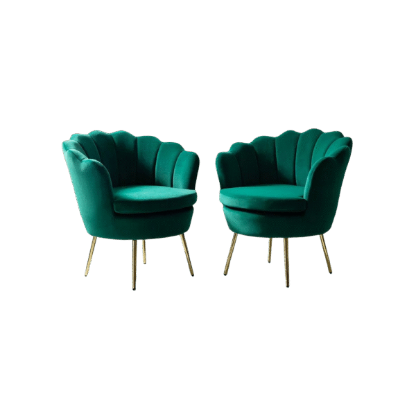 A stylish pair of emerald green coffee chairs with scalloped shell-inspired backrests, plush velvet cushioning, and sleek gold-finished legs. Perfect for modern living spaces and lounge settings.