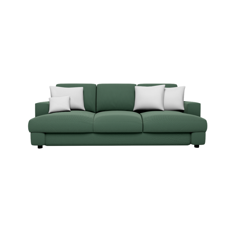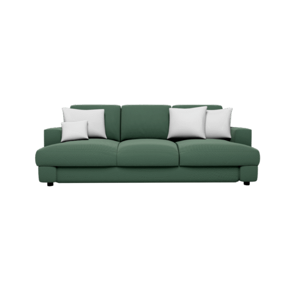 Bring elegance and comfort to your living room with this sleek green 3-seater sofa. Upholstered in soft, durable fabric, it features wide cushioned seats and comes with contrasting white throw pillows for added style. Perfect for both modern and minimalist interiors.