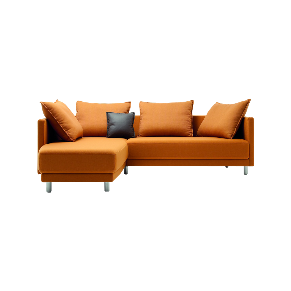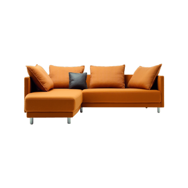 Brighten up your living room with this stylish orange L-shaped sectional sofa. Upholstered in high-quality fabric, it comes with multiple plush cushions for ultimate comfort. The contemporary design with sleek metal legs adds a modern touch, making it a statement piece for any home.