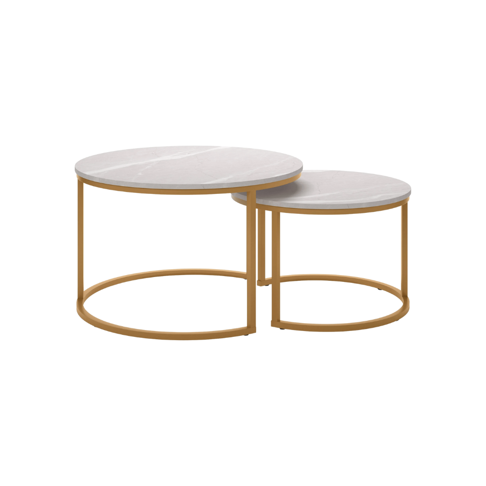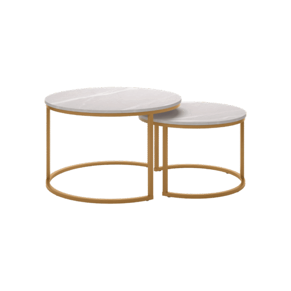 Bring elegance and functionality to your living room with this round nesting coffee table set. Designed with sleek golden metal frames and durable white marble-style UV tops, these tables are perfect for modern interiors. The nesting design saves space while offering versatile use as side or center tables.